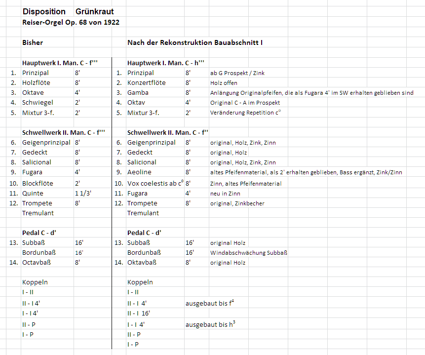 Vergleich der Dispositionen Rieser-Orgel Opus 68 von 1922 Bisher und nach der Rekonstruktion